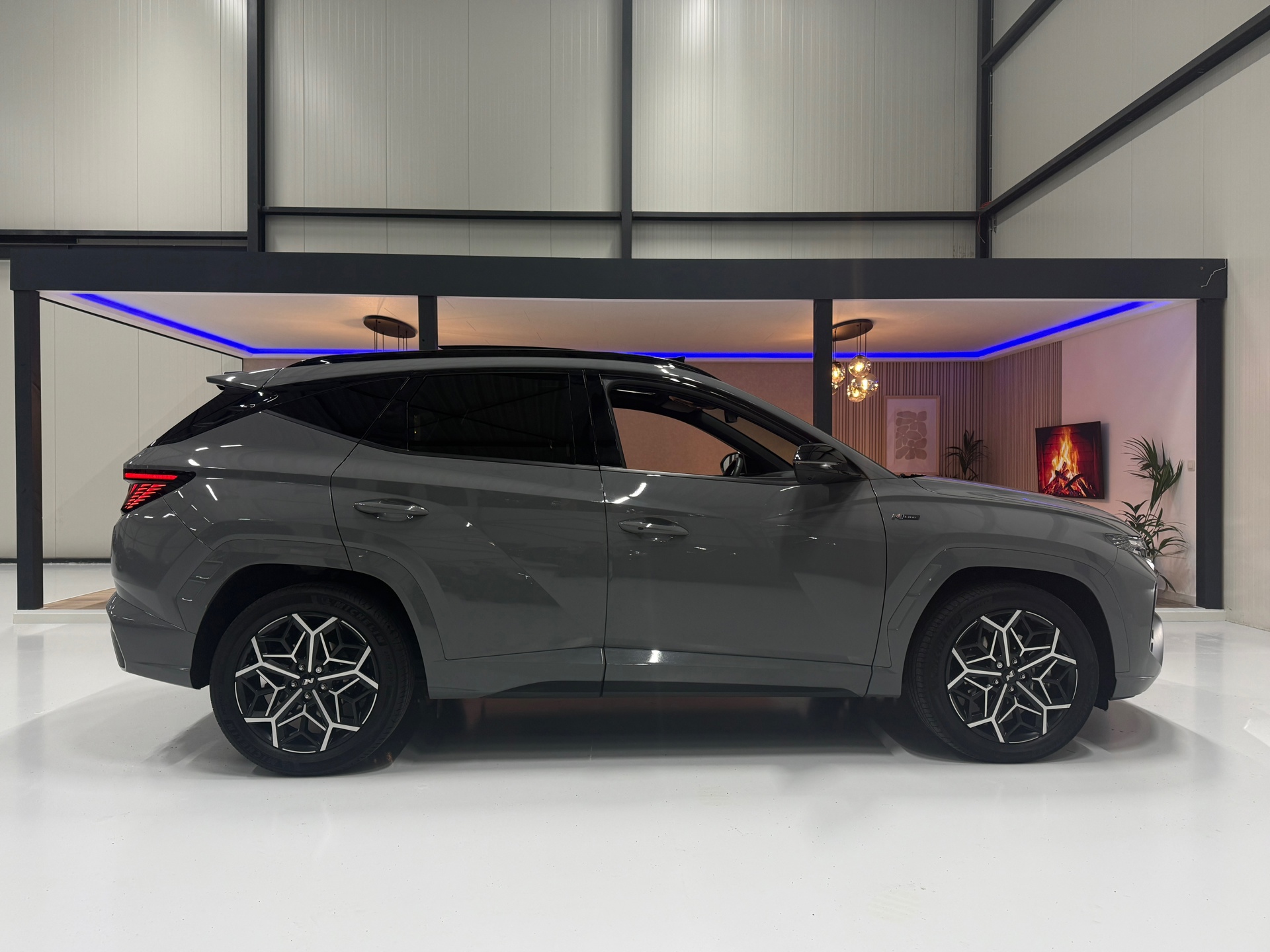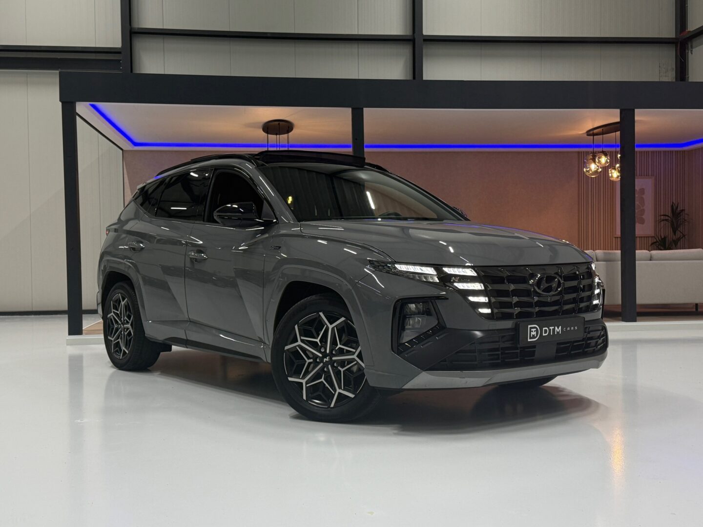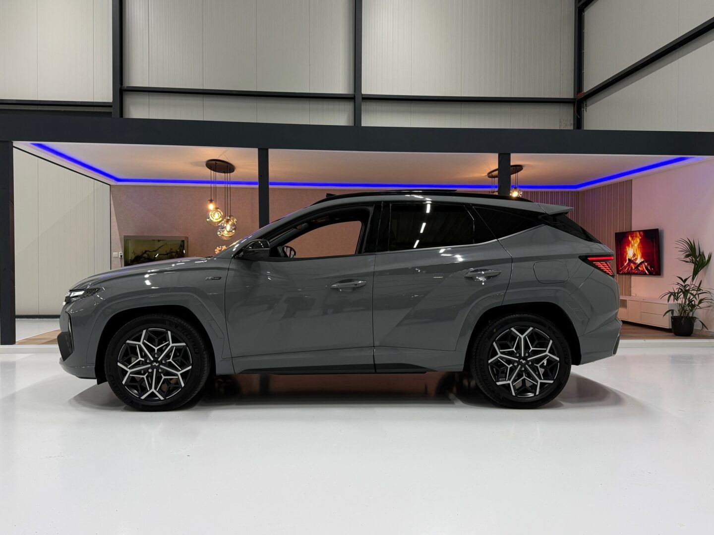 De N Line uitvoering geeft de Tucson een sportieve uitstraling met 19-inch lichtmetalen velgen, Alcantara/leder interieur met rode accenten en het stijlvolle Black pakket. Comfort en luxe staan centraal met elektrisch verstelbare stoelen voor bestuurder en passagier, inclusief geheugenfunctie, stoelverwarming en ventilatie, een panoramisch dak en rolgordijn achter.